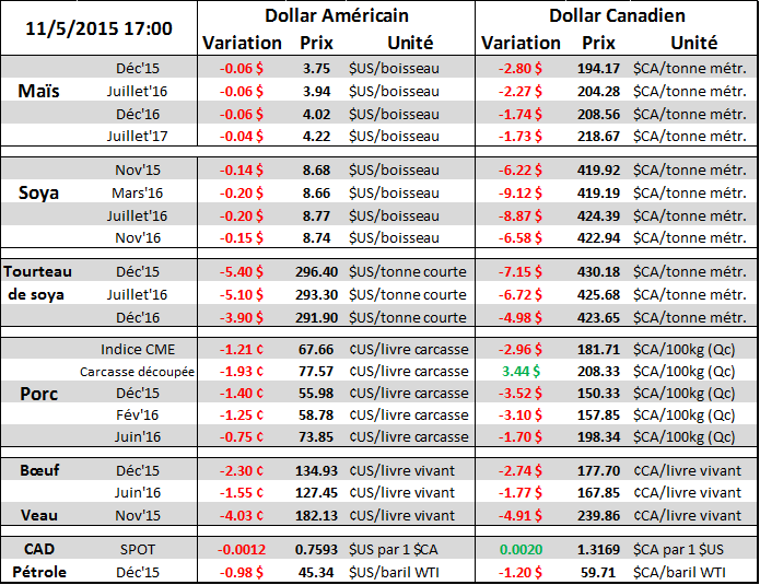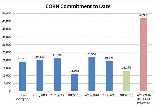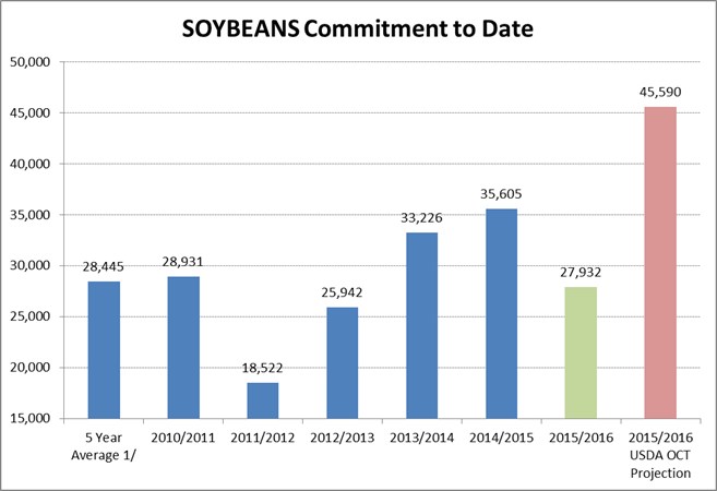 Maïs : Les ventes nettes totalisent 556K tonnes et bien qu’en ligne avec les attentes, elles sont loin d’être impressionnantes. L’exportation roule à pas de tortue et aucunes des 9 premières semaines de commercialisation 2015/16 n’a atteint la cible USDA pour respecter la projection 46.9M tonnes. Le programme d’exportation est clairement en retard et les 13.145 millions de tonnes vendues représentent une baisse de 32% par rapport à l’an dernier et définitivement une révision du ministère de l’agriculture est à prévoir dans les prochains rapport (graphique 2).