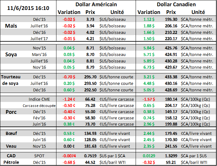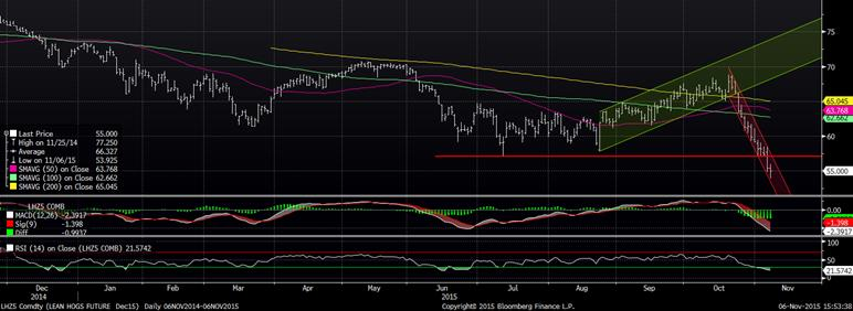 En outre, le prix des viandes rouges ont connu une sévère correction cette semaine avec une baisse de 4¢/lb pour le porc et 5¢/lb pour le bœuf. Le prix du porc sur décembre a brisé hier son support à 57.00 (graphique 3) pour finir la semaine à 55 ¢/lb. La pression du marché cash continue à se faire ressentir avec une baisse de 10% cette semaine (-6.5 ¢/lb) et de 3¢/lb de la carcasse découpé. Définitivement, le gros perdant c’est le prix du bacon qui s’est replié de 30% depuis 2 semaines. Il est normale que le prix du porc baisse durant le mois de novembre, mais la baisse est beaucoup plus prononcée depuis le rapport de l’OMS (graphique 4). Les chiffres de production deviennent secondaire, c’est maintenant la demande qui dictera le marché du porc. Notez qu’on est sous les niveaux de l’ASRA au Québec pour le reste de 2015 et même qu’il n’y a aucune profitabilité pour l’ensemble de 2016, la situation ne peut donc pas se détériorer d’avantage pour la production de porc assurée. Il reste à voir si les faibles prix stimuleront la demande (locale ou internationale) pour 2016.