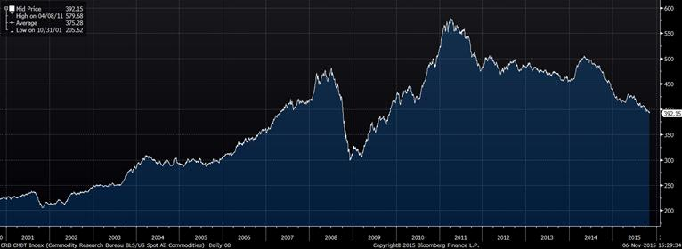 · Indice CRB des prix des matières premières touche son plus faible niveau depuis 2009, fortement influencé par le $US