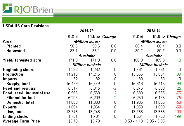 Ø Éthanol : sévère correction qui n’était pas attendue. Le ministère de l’agriculture nous dit qu’étant donné les prix très faible du sorgo (sorghum), les usines d’éthanol utiliseront plus de ce type grain pour la transformation en éthanol. Ce qu’il faut retenir c’est que la production d’éthanol n’est pas en danger, mais que les blender utiliseront un substitut meilleur marché pour la transformation. La baisse de 75M de boisseaux de maïs est entièrement compensé par une augmentation de 85M de boisseaux dans le sorghum.
