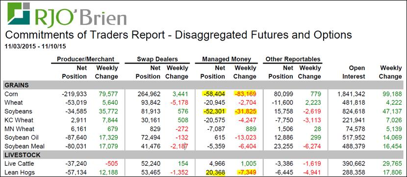 Entre le 4 et 10 novembre, les spéculateurs ont vendu 83,000 contrats de maïs (tableau 3), renversant la position d’acheteur à vendeur net de -58,400 contrats. Aussi, il ne serait pas surprenant que les ventes se soient accumulées au courant de la semaine dernière après la publication du rapport Offre et Demande le 10 novembre. Un autre gros changement est dans le soya où les spéculateurs ont vendu 31,825 contrats pour augmenter leur position de vendeur à 52,300. Dans les viandes, ils n’ont pas trop changé leur position dans le bœuf qui est près du plus faible niveau enregistré avec seulement 5,000 contrats, ils ont plutôt favorisé la vente dans le marché du porc en réduisant leur position par 7,350 contrats.