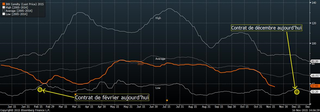 Dès l’ouverture de ce matin, le bœuf s’est transigé « limit down », accoté sur la limite journalière de 3 ¢/lb pendant toute la journée. Il n’y avait pas tellement de nouvelle autre que le prochain gouvernement argentin (en avance dans les sondages) veut enlever la taxe à l’exportation sur les matières agricoles, dont le bœuf. En après-midi, on a constaté que le prix de bœuf select à la sortie de l’abattoir est à son plus faible prix depuis décembre 2013 à 196.99 $US/100lbs. Dans le porc, la valeur de la carcasse à la sortie des abattoirs a augmenté de 1.33 $US/100lbs à 74.69$, propulsée par la longe, l’épaule et le jarret. Néanmoins, le prix du porc continue sa chute, en baisse de 3¢/lb à Chicago. Bien que les abattages de la semaine dernière étaient très élevés, plusieurs analystes prétendent que le prix est « survendu » mais qu’une continuation de la baisse reste probable à court terme. Dans une tendance, le prix a toujours plus de chance de suivre la tendance que de la briser, d’où le vieux dicton en finance « the trend is your friend ». Présentement, on voit une diminution moins prononcé sur le marché comptant (graphique 4) alors que les contrats de décembre et février sont sous le plus faible prix cash enregistré depuis 10 ans (pour leur date d’échéance). Normalement, le prix comptant à tendance à remonter durant la 2ème moitié de novembre… il reste à voir si la saisonnalité s’appliquera à 2015.