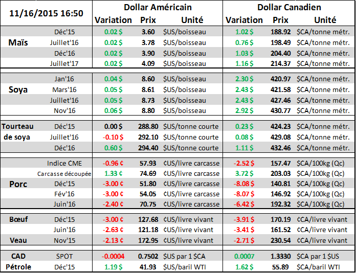 · Le prix du porc et du boeuf finnissent tous deux “limit down”, en baisse de 3¢/lb