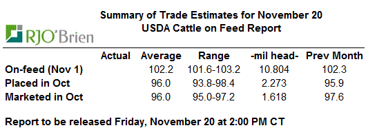 Cattle-On-Feed : demain l’USDA va sortir le rapport mensuel sur l’élevage bovin. Par rapport à Octobre 2014, le marché s’attend à une augmentation des bœuf en parc d’engraissement (+2.2%), une diminution des placements (-4%) et aussi une diminutions de la mise en marché (-4%). Voici les estimés pour le rapport de demain.