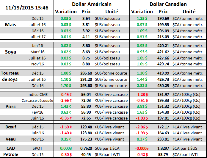 Élection en Argentine : Les Argentins s’apprêtent à retourner aux urnes pour élire le président ce weekend. Essentiellement la compétition est entre Mauricio Macri et Daniel Sciolo. Ce qu’il faut retenir c’est que le parti de Macri propose beaucoup de changement, dont l’abolition de la taxe spéciale sur l’exportation de grain. Pour l’instant il semble être en avance dans les sondages et l’impact de l’abolition de la taxe est d’augmenter l’offre de grain au niveau international. Plus de grain, plus de compétition, le prix pourrait chuter! C’est sûr que dans la logistique des choses, si Macri est élu il va officiellement entrer en poste en décembre et avant de modifier les lois et les taxes cela peut prendre un certain temps. Par contre, la taxe sur l’export est un enjeu électoral majeur et l’impact devrait être rapide puisque le marché à terme est un marché par anticipation pure. C’est-à-dire que la réaction au niveaux des prix pourraient bien être immédiate d’où l’importance de suivre le développement des élections ce dimanche au lieu d’attendre le fait accompli à l’hiver quand le Brésil va sortir une récolte qui s’annonce record.