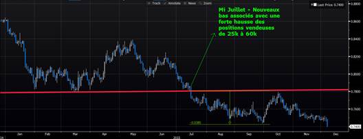 Mi-Juillet 25k contrats Short, CAD fait un nouveau bas et s’est associé à une forte augmentation des positions short, alors le Canadien pourrait se retrouver proche des 71 cts d’ici fin Janvier.
