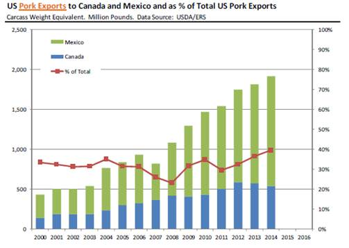 Le Canada et le Mexique représentent une part importante des exportations Américaines. Environ 30% pour le bœuf et 40% pour le porc.