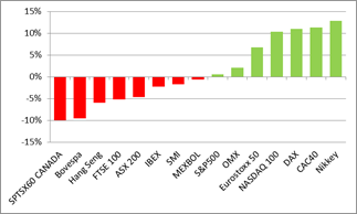L’indice Canadien a eu la plus mauvaise performance de tous les indices majeurs en baisse de plus de 10% cette année. Les secteurs des métaux et de l’énergie ayant fortement impacte l’indice ainsi que les débâcles de Valeant et de Bombardier. Ces baisses sont encore plus élevées pour des investisseurs Américains puisque le CAD a parallèlement recule de 14%.
