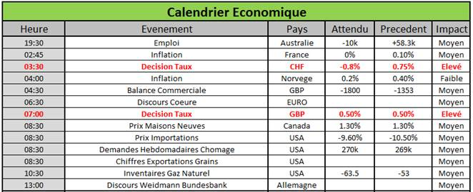 Pour demain, nous serons attentifs aux réunions des banques centrales Suisses et Anglaises. Aucune décision d’importance ne devrait être prise, mais en raison de la volatilité actuelle dans les devises, le risque demeure clairement dans la Banque centrale Suisse. 4 analystes sur 19 s’attendent même à une baisse des taux.