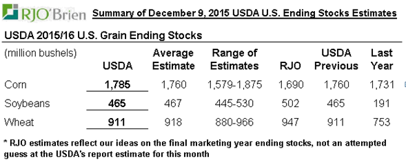 Les Stocks de maïs sont légèrement revus à la hausse à 1.785 Milliards de boisseaux contre 1.760 en novembre et attendu par les analystes. Cette légère hausse provient notamment d’une baisse des exportations de 50 millions de boisseaux qui seront en partie (25m) compensés par une utilisation plus grande pour la production d’éthanol.