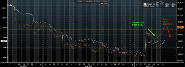 L’Euro a réussi à dépasser son niveau post BCE de la semaine dernière. Comme la semaine dernière nous estimons la première réaction exagérée et nous nous attendons à un retour sur l’Euro notamment. Les spéculateurs étaient très short et les mouvements de couverture sont très violents.