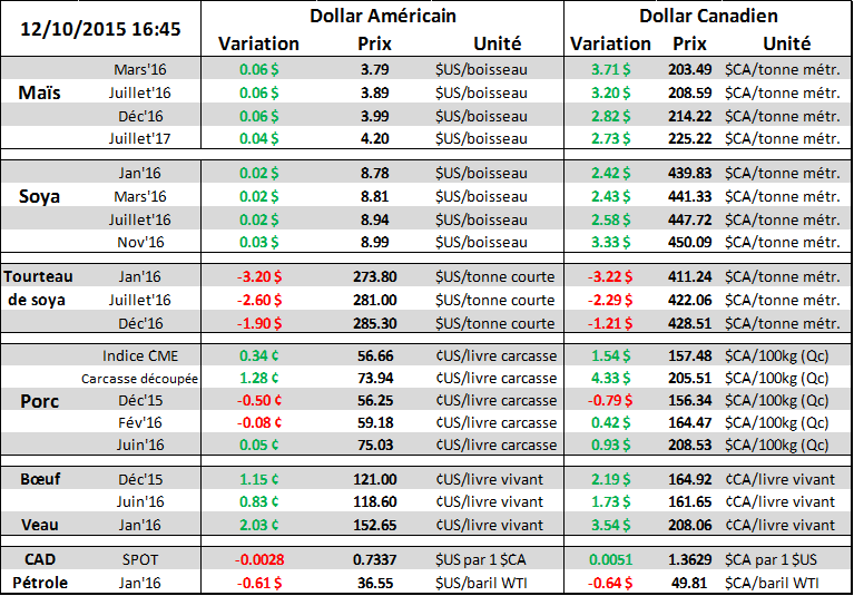 Le prix du maïs termine la journée avec un gain de 1.5% basé sur des perspectives de demande plus forte. D’une part, la production d’éthanol était très forte la semaine dernière à 993,000 barils par jour ce qui est la deuxième plus forte production hebdomadaire de l’histoire. De plus, même si la production était énorme, les inventaires ont diminué supportant l’idée que la demande est très forte ce qui coïncide avec les plus faibles prix de gazoline en 7 ans. On a vu hier l’USDA augmenter ses prévisions de consommation de maïs pour la production d’éthanol par 25 millions de boisseaux et si la tendance se maintient, d’autres augmentations pourraient subvenir cette hiver.