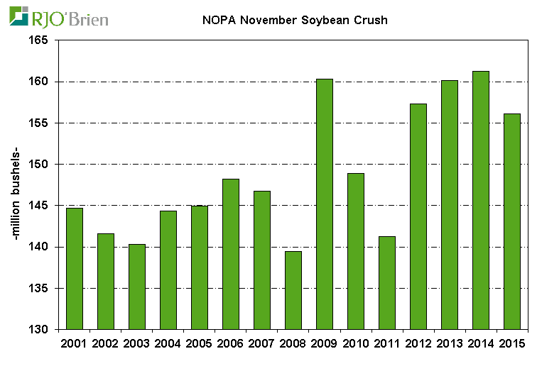 Trituration de soja (Nopa Crush) : Les chiffres d’utilisation de fève pour la transformation en huile et tourteau ont été plus faible que les prévisions des analystes. À 156.1 millions de boisseaux, c’est beaucoup plus faible que la moyenne des prévisions à 161.7 et même carrément à l’extérieur de la fourchette (157.7 à 165.4). La transformation en novembre 2015 sera la plus faible en 4 ans malgré l’abondance de fève. La récolte de soja s’est déroulée sans trop de misère et nous pensons que le volume record de septembre et octobre contribuent fortement à la transformation plus faible en novembre. Sommes toute le trimestre aura vu près de 472 millions de boisseaux, contrairement à 440 l’an dernier et il faudra donc transformer 1.418 milliard de boisseaux pour le reste de l’année de commercialisation 2015/16 afin d’atteindre la cible USDA de 1.890 milliard lors du dernier rapport WASDE.