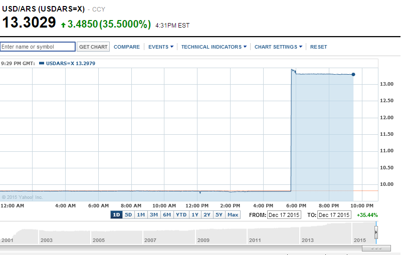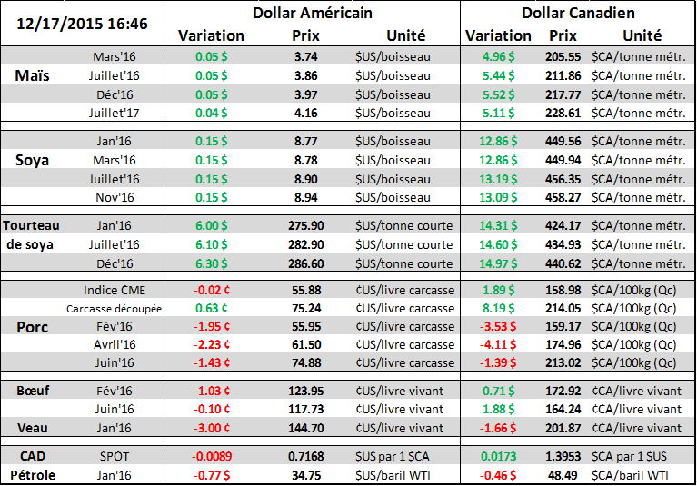 Argentine : Le peso argentin s'est effondré jeudi face au dollar, au lendemain de la levée par le nouveau gouvernement du contrôle des changes, afin de gagner en compétitivité et de relancer une économie en perte de vitesse. C’est important pour le commerce de grain car cela annonce fort possiblement un afflux supplémentaire de céréales sur le marché mondial puisqu’en une seule journée le producteur argentin reçoit 30% de plus sur la valeur de son inventaire! En plus l’Argentine a libéralisé ses échanges et aboli les taxes sur l’exportation de grain ; sauf le soja où ils maintiennent une taxe de 30% au lieu de 35%. L’Argentine est le 5e producteur de maïs et 3e producteur de soja au monde. Contrôlé depuis 2011 par des mesures monétaires, le peso est maintenant dans un libre marché et il faut désormais 13.30 peso pour 1.00 dollar US.