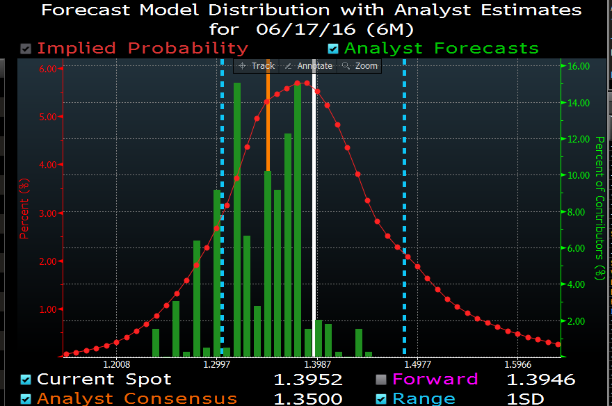 Dollar Canadien : la tendance se poursuit et le huard ne fait que faiblir face au USD. Nous avons passé des niveaux que nous avions pas vu depuis 11 ans! La chute de prix de l’ensemble des matières premières et la divergence entre le Canada/USA sur la politique monétaire sont les grands responsables! Le baril de pétrole vaut moins de 35$, la FED hausse les taux d’intérêt face à une économie en vigueur tandis que la Banque du Canada songe à faire exactement le contraire pour stimuler l’investissement. Ça donne tout un cocktail pour avoir un dollar canadien très faible face au USD. Par contre très peu d’analyste avaient cru à un mouvement aussi rapide de la devise. Bloomberg rend publique les probabilités et les prévisions des analystes et à la lumière de ces observations force d’admettre que le mouvement est spectaculaire! Le graphique ci-bas montre que la vaste majorité des analyste prévoyaient un dollar canadien à 1.35 alors que nous avons touché 1.40 en cours de séance aujourd’hui.