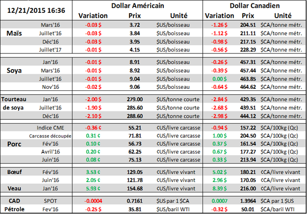 Porc : Initialement en hausse de près d’une cent pour suivre le mouvement haussier dans le bœuf, les prix n’ont pas été capables de soutenir la tendance. L’abattage et la production est tout simplement écrasante ; on évalue à 445,000 tête l’abattage aujourd’hui uniquement. Les chiffres de la semaine dernière ont atteint 2.493 millions et 2.426 la semaine d’avant. L’indice des prix cash sera calculé à 54.65 demain par le CME, en baisse de 0.56. Le prix de la découpe demeure cependant élevé à 71.81. Coté jambon rien de trop positif encore la découpe baisse de 0.59 et s’établie à 59.17 cents sur le prix américain et représente une baisse de 14% en 4 jours! En fait on ne le remarque pas toujours en épicerie mais clairement en ce moment je vois l’impact de prix un le bœuf et le porc! Pas souvent que le demi-jambon Lafleur est à 1.79/lbs dans la circulaire IGA…