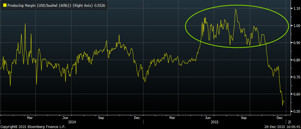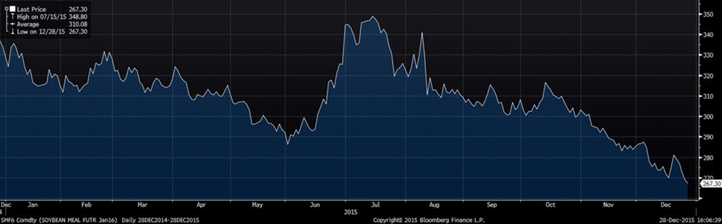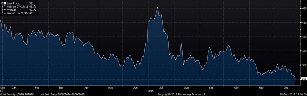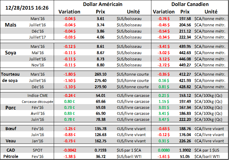 En cette dernière semaine de 2015, le prix des grains semble terminer l’année sur un ton baissier. Le contrat de maïs sur mars a terminé la journée à son plus bas prix, soit 3.61 $US/boisseau (graphique 1). La pression négative provenait d’outremers, plus précisément de Chine, où le prix à la Bourse Chinoise Dalian a perdu 1.7% la nuit dernière sur des anticipations que Beijing va accélérer la liquidation de ses inventaires « stratégiques » de maïs ce qui augmentera l’offre de maïs en sol chinois et par la bande, ça devrait avoir un impact négatif sur les ventes de maïs américains. Rappelons-nous que la Chine détiendra 114 millions de tonnes à la fin de l’année commerciale 2015/16 (selon les estimés USDA) ce qui est 54% des inventaires mondiaux. Autrement dit, les inventaires chinois représentent 12% de la production annuelle au monde. Évidemment, si la liquidation des inventaires est massive, cela pourrait continuer à faire baisser le prix en Chine et mondialement. Toutefois, selon l’agence de presse officielle de Xinhua, le gouvernement chinois aurait dit qu’il a l’intention de réduire l’acréage de maïs pour la prochaine année afin de continuer la liquidation des réserves. Cela pourrait s’avérer positif pour le prix à moyen terme puisque la Chine représente le 1/4 de la production mondiale et sa demande est sans cesse grandissante.