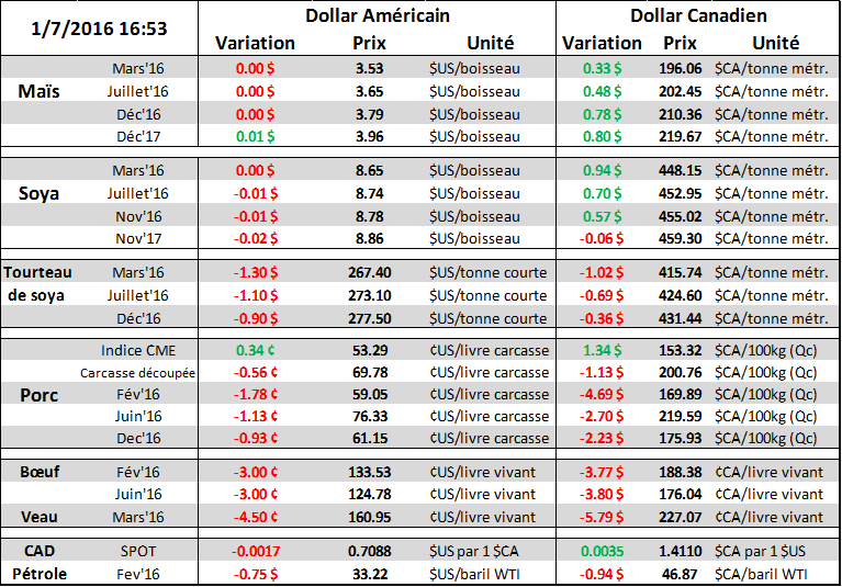 Le marché des viandes semblent avoir subi la pression négative reliée à l’incertitude des marchés. Malgré que le prix de la découpe de bœuf était en hausse de 2¢us/lb ce matin, on termine la journée accoté sur la limite baissière de 3¢/lb et de 4.5¢/lb pour le veau. Les limites augmenteront donc de 50% demain, la variation maximale sera de 4.5 ¢/lb dans le bœuf et 6.75 ¢/lb dans le bouvillon. En novembre, les exportations américaines nettes de bœuf étaient positives (graphique 3), une première depuis février 2014! En fait, les américains n’ont pas vendu plus de bœuf, c’est seulement les importations en provenance de l’Australie qui ont dramatiquement chuté. À près de 50% du volume moyen de 2015, les achats de bœufs australiens totalisent seulement 66.6M livres principalement dû au quota imposé par le gouvernement américain. Les achats en provenance d’Australie devraient rester faible pour décembre aussi.