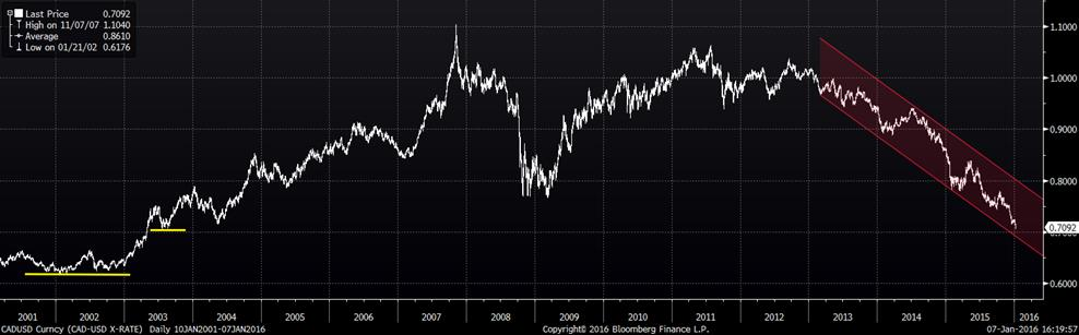 Ce matin, le gouverneur de la Banque du Canada affirmait que l’économie mondiale devrait retrouver une certaine accélération plus tard en 2016. Au Canada, il faudra être patient puisque ça nécessitera du temps pour que l’économie canadienne complète sa transition d’une économie basée sur les ressources vers une économie plus diversifiée. Néanmoins, le gouverneur Poloz laisse sous-entendre qu’il faudra voir les actions prises par le gouvernement Trudeau pour stimuler l’économie avant de toucher au taux directeur, pour ne pas le baisser prématurément. Par contre, les économistes parlent qu’une baisse de taux pourraient subvenir si les taux obligataires canadiens suivent la tendance haussière des États-Unis. Bref, ce qu’il faut retenir c’est qu’en période d’instabilité, les investisseurs se réfugie en dollar américain et dans l’or (+4.6% en 2016) ce qui pourrait maintenir la force du $US en place. Le taux CAD/USD a touché un creux de 0.706 ce matin avant de rebondir à 0.709 pour la fermeture. C’est le plus faible taux depuis 2003 (graphique 2) et si la baisse continue un peu, le prochain support long terme est de 0.620 CADUSD en 2002.