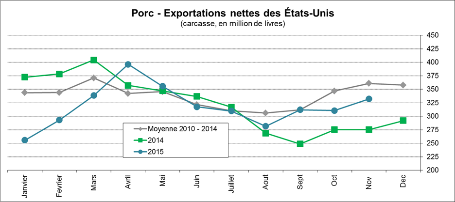 · En novembre, les américains ont exporté 332M livres de porc, au-dessus de 2014 mais sous la moyenne quinquennale.