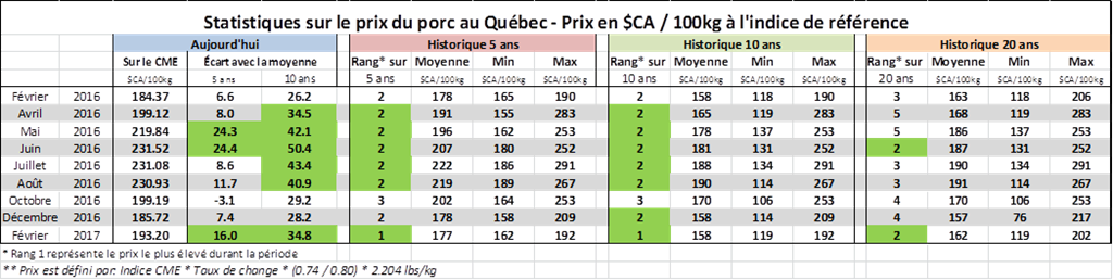 · Le prix du porc en $CA explose, à 232 $CA/100 kg sur juin et 194 $CA/100kg pour février 2017
