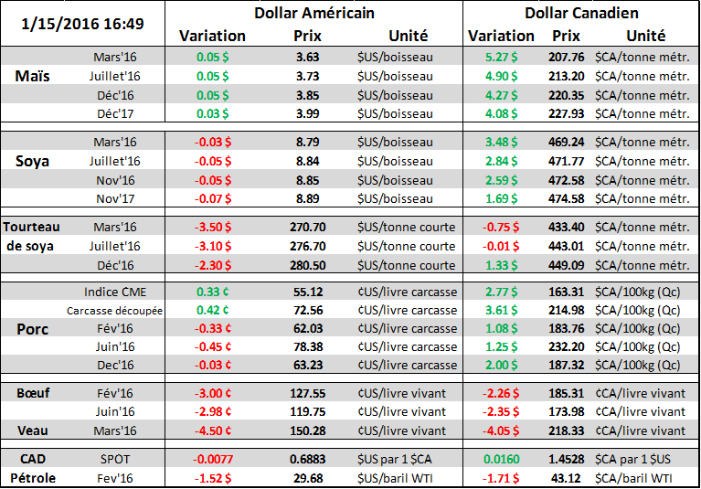 Les abattages de porc et de bœuf étaient plus élevés cette semaine qu’à pareille date en 2015. Il s’est abattu 2.30 millions de porcs aux États-Unis, soit 2.5% de plus que l’an dernier. Toutefois, les carcasses sont 3 livres de moins que l’an dernier, ce qui nous donne une production nette de 490 millions lbs, en hausse de 1.2% versus 2015. Dans le bœuf, les abattages étaient en hausse de 3.3% à 568,000 têtes. Contrairement au porc, la carcasse de bœuf est bien plus pesante que l’an dernier, soit 25 lbs carcasses de plus. Au final, la production de bœuf était 6.3% de plus que l’an dernier à 475 millions lbs.