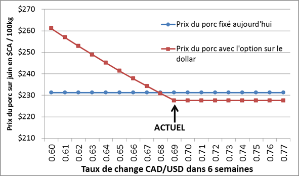 La première possibilité est de vendre les contrats à terme de porcs et acheter ceux sur le dollar canadien, on vient donc fixer notre revenu futur. Cela est représenté par la ligne bleu du graphique 2. Pour ceux qui sont très pessimiste sur le dollar canadien et qui aimerait profiter de l’opportunité tout en maintenant une certaine flexibilité pour fermer le dollar plus tard, il est possible d’acheter un option call plutôt qu’utiliser le contrat sur le dollar canadien. Au coût d’environ 3.00$CA/100kg, on peut vendre le contrat à terme sur le porc et acheter un option call sur le dollar, expiration dans 6 semaines. Cela nous permet d’attendre et de fixer le dollar canadien d’ici le 4 mars. Si le dollar continue à chuter, tant mieux. S’il monte, je suis protégé et mon prix scénario est de vendre à 232 $CA sur juin, moins le coût de l’assurance de 3.00 $CA/100kg. Cela est représenté par la ligne rouge du graphique 2.