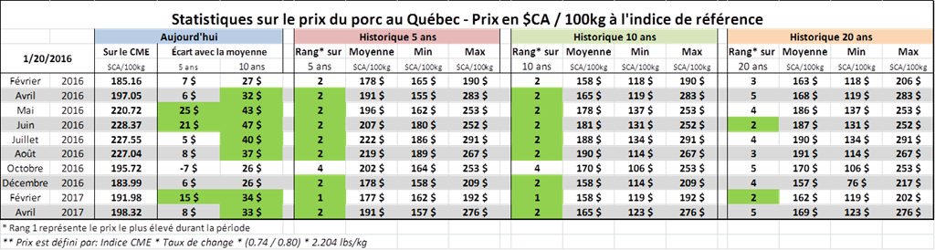 Le contrat de février aura transigé au-dessus des 63 cents en fin de session ce qui donne une prime de plus de 6 cents sur le cash. La valeurs en dollar canadien pour le 100kg à l’indice atteignent des prix très intéressant ; de 185$ en février à 228$ en juin.
