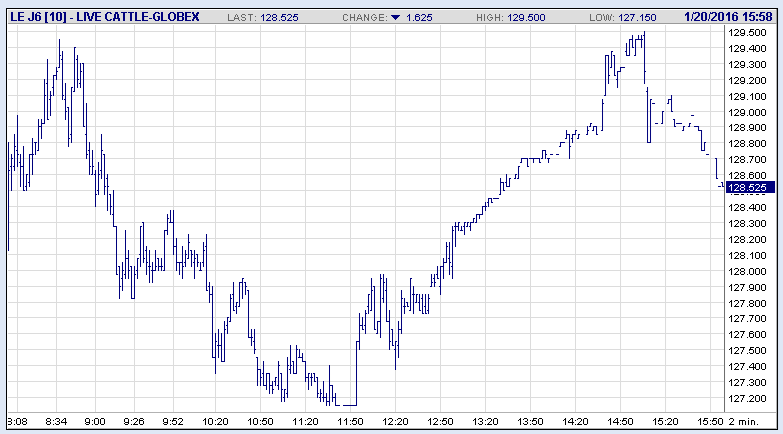Live Cattle : Après avoir transigé limit down pendant la journée, le marché a complètement viré de bord. Beaucoup de volatilité à l’aube du rapport cattle-on-feed de vendredi. Selon Allendale, les placements en décembre seraient en baisse de 4.7% à 1.465 millions de têtes et serait le plus petit nombre depuis le début des statistiques en 1995. Les marges d’engraissement calculées par l’USDA suggèrent une perte record de 541$ par bœuf avec l’hypothèse d’un bouvillon de 1,250 livres.