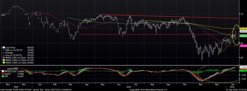 · Porc: La tendance haussière se poursuit sur les livraisons rapprochées, la résistance de 68.00 brisée aujourd’hui sur avril