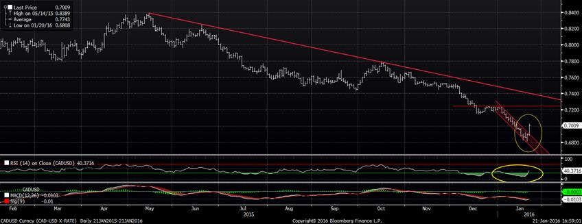 Gros rebond de 1.5% suite à l’annonce de la Banque du Canada sur le maintien du taux d’intérêt à 0.50% ainsi qu’une hausse de 5% du prix du pétrole aujourd’hui. Sans surprise, le marché était survendu en janvier avec un RSI entre 10 et 20, ce qui explique un peu la volatilité d’aujourd’hui… tous les acheteurs étaient patients et tout le monde a sauté dans le bateau en même temps!