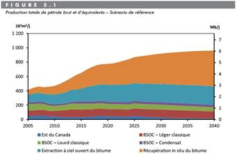 Dans ce scenario, les investissements devraient se poursuivre pour augmenter la production canadienne d’environ 60% d’ici 2040. La production serait d’environ 6.1 Mb/j.