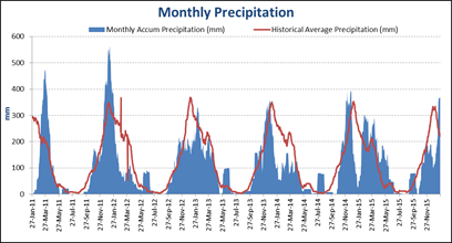 Comme vous pouvez le voir ci-dessous, les précipitions ont été largement supérieure à la moyenne dans la région de Minas Gerais pour le mois de janvier. Ils ont reçu environ 368 mm à date contre 221 mm en moyenne les dernières années.