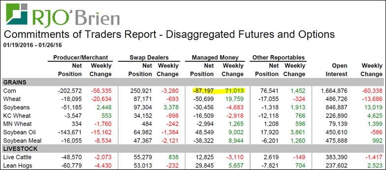 Entre le 19 et 26 janvier, les spéculateurs ont finalement racheté une grosse portion de leur position vendeur sur le marché du maïs. Plus précisément, ils ont acheté au net 71,000 contrats de maïs ce qui fait passer leur position de -158,000 à -87,000 contrats, alors que c’est principalement les producteurs qui ont pris la contrepartie en vendant leur récolte. Ce rachat était attendu suite au rapport de l’USDA du 12 janvier. Par contre, le fait que le prix a très peu bougé durant cette période n’augure pas trop bien. Clairement, les producteurs ont beaucoup d’inventaires à vendre prochainement et ils seront présents ce qui devrait limiter l’appréciation du prix du blé d’Inde. Incapable de franchir le cap du 3.72 $US/boisseau sur mars, le momentum haussier s’évapore graduellement et on perd la petite tendance haussière en place depuis la mi-janvier. Par ailleurs, les spéculateurs ont aussi acheté du blé, du tourteau et de l’huile de soya. En somme, en regroupant les 13 matières premières agricoles à la Bourse, les spéculateurs sont rendus net acheteur, une première pour 2016.