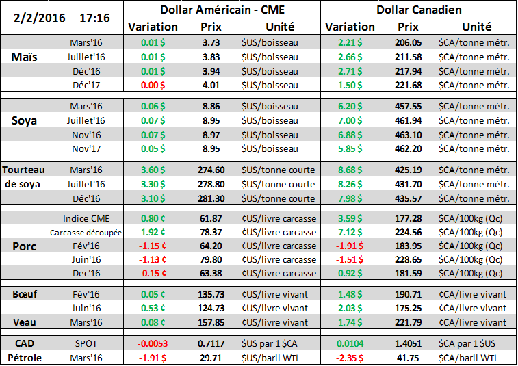 · Le prix cash du porc continue sa tendance haussière, en hausse de 9.5 ¢/lb en 2016