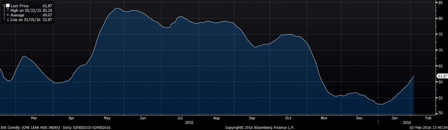 Contrairement à l’ensemble des marchés, que ce soit les indices boursiers ou les matières premières en général, le prix du porc est contre tendance et s’est nettement apprécié en 2016. Disons qu’on partait de bas ce qui facilite l’appréciation de 18% du prix cash du porc aux États-Unis, passant de 53 ¢us/lb à 62.50 pour l’indice qui sera publié demain (soit la moyenne du 1er et 2 février). Le prix cash pour la journée d’hier isolément était de 63.02 ¢/lb, la tendance semble donc vouloir continuer avec une cadence moyenne de 0.60 ¢/lb par jour depuis 2 semaines (graphique 1).