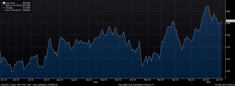 Les prix des contrats à terme de décembre sont à 181 $CA/100kg présentement (graphique 3), c’est 25$CA/100kg de plus que l’an dernier.