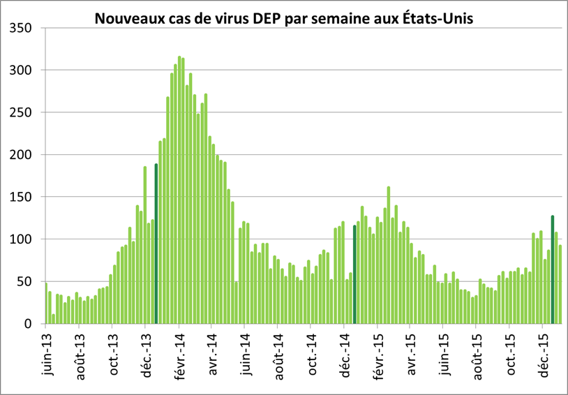 On a très peu parlé des nouveaux cas de DEP aux États-Unis cette année, la raison est bien simple. Il n’y a rien d’alarmant. Toujours avec une centaine de nouveaux cas par semaine, il ne semble pas avoir une perte de contrôle (graphique 2). L’amélioration dans la biosécurité ainsi que les températures largement au-dessus de la normale sont probablement les principaux facteurs pour expliquer la non-propagation du virus. Nous devrions donc avoir plus de porcelets après sevrage que l’hiver dernier, alors qu’il était déjà à un record pour une période hivernal à 10.23. Nettement mieux que l’année 2014 lors du ravage de la DEP ce qui avait fait chuter le nombre moyen de porcelet à 9.53 par portée.