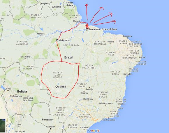 De plus, le Brésil investie de plus en plus dans ses infrastructures pour contrecarrer les délais de livraisons. Un nouveau terminal de grains dans l’Amazon est cédulé pour commencer les exportations en juillet, afin de décongestionner les ports plus au sud ainsi qu’à diminuer les frais de transport à l’intérieur du pays. L’objectif est de pouvoir sortir 6.5 millions de tonnes/an d’ici 5 ans, principalement du plus gros état producteur,le Mato Grosso. Le grains prendera la route vers le nord, par la « route du soya » qui est l’autoroute BR-163, pour ensuite se déplacer par barge dans la rivière amazonienne (image 2). Attention aux piranhas et serpents !!
