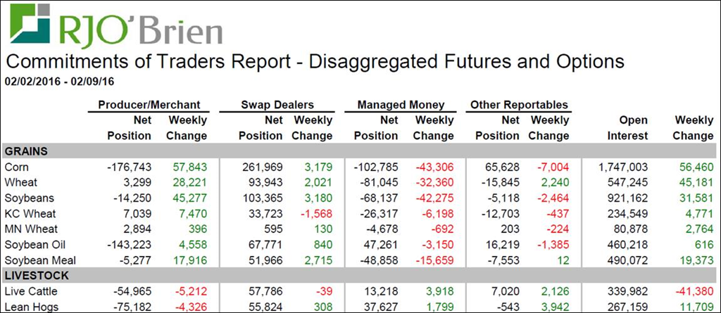 Du 2 au 9 février, les spéculateurs ont massivement vendu du grains (tableau 3) à plus de 40 000 contrats de maïs, les blés et soya. Les spéculateurs retournent donc à plus de 100 000 contrats vendeur au net, soit 5.9% de tous les contrats de maïs. Dans la fève, ils ont désormais 68 000 contrats vendeur ce qui est 7.4% de la totalité des positions ouvertes, la position est donc plus petite que celle dans le maïs, par contre elle est relativement plus grosse compte tenu du marché. Dans tous les blés, la position totalise 112 000 contrats vendus ce qui représente 13% des contrats ouverts, près du record historique de -15.5% (voir PDF en attachement). Dans le marché des viandes, les spéculateurs ont un peu acheté, mais rien de majeur.