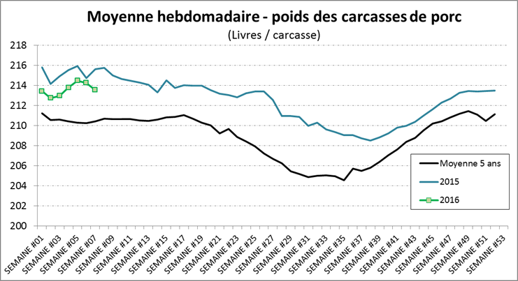 Sans surprise, les abattages de cette semaine sont supérieurs à la semaine dernière en raison des livraisons qui étaient retardées à cause des tempêtes de neige. Dans le porc, les abattages de cette semaine devraient atteindre 2.28 millions têtes, soit 4.8% de plus que la semaine dernières et 2.5% de plus qu’en 2015 (graphique 1). Le poids des carcasses demeurent toujours un peu sous les niveaux de l’an dernier (graphique 2). En somme, la production de la semaine était de 487 millions de livres ce qui est 2.0% de plus que l’an dernier et vient combler le manque de la semaine dernière. La valeur de la carcasse découpé semble plafonner tranquillement, toujours entre 75 et 77 ¢us/lb carcasse, incapable de faire des nouveaux sommets pendant que le prix cash du porc monte. La fête de Pâques est dans 6 semaines ce qui devrait normalement venir support la demande pour le jambon, mais on dirait que l’effet sur le prix est nul, le prix du jambon n’a jamais dépassé le 60¢us/lb depuis la mi-décembre (actuellement à 56 ¢us/lb)… le risque serait que le prix du jambon reste faible ou même s’affaiblit après la demande reliée à Pâques ce qui serait un obstacle à l’ascension du prix cash.