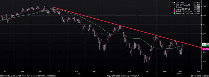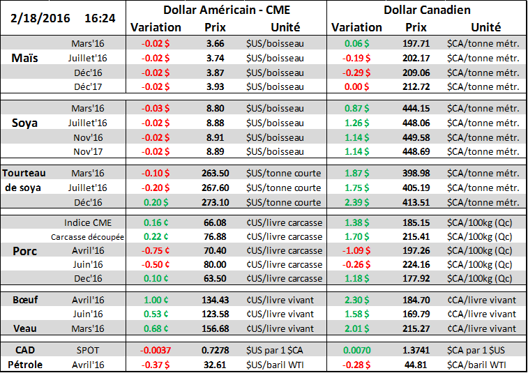 Dans le bœuf, le prix est dans le vert pour une troisième journée consécutive, mais fait présentement face à sa résistance (graphique 4) depuis les sommets de l’été dernier. Cela resserre la marge des abattoirs puisque le valeur du bœuf découpé maintient sa tendance baissière à 209 ¢us/lb (bœuf select), conséquemment la marge des abattoirs restent négative à -40 $US/tête. Demain sera une journée décisive pour savoir si on brisera la tendance baissière ou pas. À 3h00, ce sera le rapport du nombre de bœuf en parcs d’engraissement au 1er février, dont les estimés sont à 99.6% pour les placements de janvier et 97.8% pour la commercialisation. Au net, la quantité de bœuf en parc est prévue pour diminuer par 0.2% versus le 1er février 2015. Par ailleurs, il faut s’attendre à ce que la quantité de bœuf en parc augmente légèrement en 2016 afin de reste en ligne avec l’expansion du cheptel et la production prévue pour 2016 (tableau 5). L’USDA prévoyait une production bovine 5% plus élevée que l’an dernier au 3ème trimestre… s’il n’y a pas plus de placement ces prochains mois, il faudra un poids excessivement élevé pour que la production croît autant, à plus de 1 400 lbs/tête. Ce serait du jamais vue, encore moins durant la période estivale.