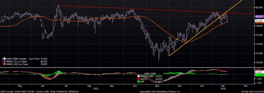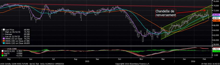 Sévère correction sur les marchés à terme de porc aujourd’hui, seulement une journée après que le contrat d’avril ait fait un nouveau haut à plus de 72.00 ¢/lb (graphique 2). Il n’y a pas vraiment d’annonce sur le fil de presse, mais il faut garder en tête que la production est très élevée alors que la marge des abattoirs rétrécit. Techniquement, la formation technique du prix d’avril est négative : (1) hier, un nouveau sommet alors que la journée se termine dans le rouge ce qui correspond à une chandelle de renversement; (2) aujourd’hui, on brise la tendance haussière et le MACD retourne en territoire négatif. Pour le contrat à terme de juin (graphique 3), nous avons tout simplement pas percé la résistance formée des hauts de juillet et octobre.