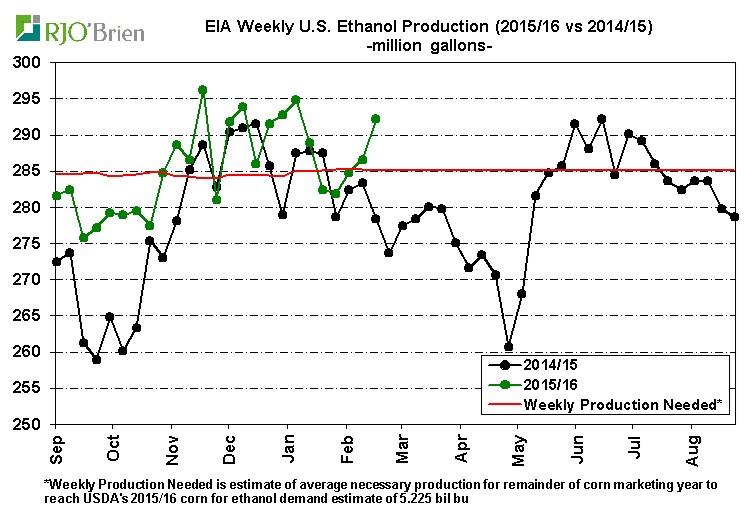 Le rythme actuel de production est supérieure au projection de l’USDA pour l’utilisation de mais dans la fabrication d’éthanol. Depuis le début de l’année de commercialisation la production moyenne est à 971,000 barils/jours c’est 2.5% plus élevé que l’an passé et mieux que le 1.6% nécessaire pour atteindre 5.225 milliards de boisseaux de maïs pour 2015/16.