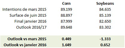 De manière générale les américains semblent vouloir remplacer les acres de blé par du maïs et laisser le soja plus ou moins inchangé par rapport à l’an dernier. C’est évident qu’il faut évaluer la variation d’un année à l’autre en utilisant les surfaces réelles, mais j’apporte quand même un bémol – les surfaces ont grandement chuté l’an passé entre les intentions de mars 2015 et le résultat final en janvier notamment dû à la météo adverse. Donc oui on parle d’une hausse de surface tant dans le maïs que le soja, mais en terme d’intentions c’est beaucoup moins impressionnant, c’est même une baisse dans le cas du soja.