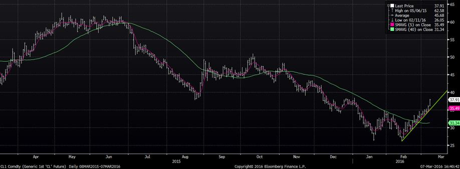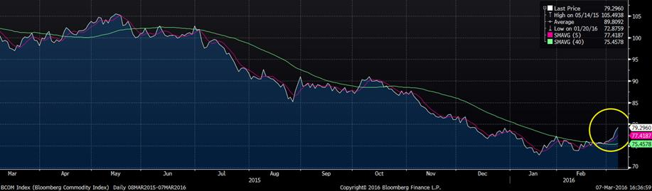 Dernièrement, le marché des matières premières a connu un regain d’énergie. L’indice de commodité de Bloomberg, regroupant le prix de 22 commodités, a augmenté de 6% en deux semaines (graphique 1 et 2). Il y a à peine 2 mois, nous étions au plus bas niveau depuis la compilation des données en 1991. Techniquement, on dirait que l’indice fait une creux et se stabilise ce qui pourrait s’avérer positive pour le prix des gains. Notamment, le prix du pétrole donne un gros support au marché des matières premières lequel poursuit sa tendance haussière depuis l’annonce de la Russie et certains membres importants de l’OPEP concernant un éventuel gel de la production. Le prix du pétrole frôle désormais le 40$US/baril sur le contrat de mai (graphique 3) ce qui donne un gros coup de pouce au dollar canadien. Les prix des métaux sont également très fort, autant les métaux industriels que les métaux précieux. Tout cela pourrait contribuer à une augmentation du prix des grains qui a une relation positive avec le prix des matières premières énergétiques et métallurgiques, contrairement aux prix des viandes qui sont très peu influencés par les autres marchés.