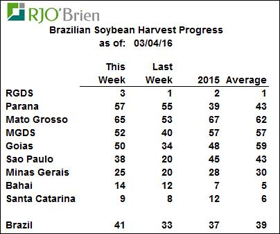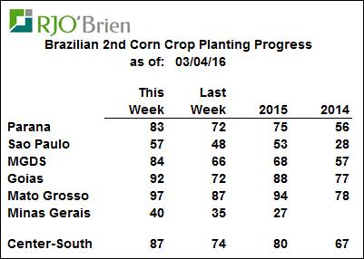 Au Brésil, tout roule comme sur des roulettes. La moisson de soya est légèrement en avance sur la moyenne quinquennale. Avec 41% de la récolte de complétée, dont 65% dans le Mato Grosso, cela donne un coussin de 2 centièmes sur la moyenne et de 4 centièmes sur l’an dernier (tableau 2). Pour la 1er récolte de maïs, on est en avance sur l’an dernier à 42% complétée contre 36%, mais on note un léger retard dans la région de São Paulo comparativement aux deux dernières années (tableau 3). Au niveau des ensemencements de la 2ème récolte de maïs, le Safrinha, on connait une progression de 13% par rapport la semaine dernière (tableau 4) ce qui donne une avance comparativement 2015 et 2014.