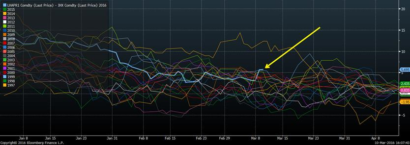 Encore aujourd’hui, le marché des viandes était assez fort. Le contrat de bœuf sur avril termine la journée à son plus haut niveau depuis 4 mois suite aux anticipations que les sorties des parcs d’engraissement resteront faibles dans les prochaines semaines, contrairement à ce qui est attendu pour la période estivale. L’écart actuel de 7 cents/lb entre le contrat d’avril et de juin est le plus élevé historiquement ce qui indique un offre serré à très court terme versus une expansion anticipée dans quelques mois. Au niveau du porc, le contrat d’avril a continué à s’apprécier aujourd’hui pour finir la journée avec un petit gain de 0.075 ¢/lb à 72.175, mais a atteint jusqu’à 72.875 au courant de la journée. Déjà au prix de fermeture, l’écart entre le contrat à terme d’avril et le prix cash est anormalement élevé (graphique 5). À 5.70 cents/lb d’écart, c’est le plus élevé à l’exception de 2014. Toutefois, l’écart est normal entre le prix cash et les mois d’été.
