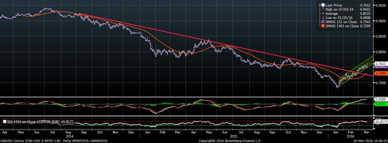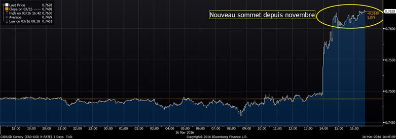 Sans surprise, la banque centrale américaine (FED) n’a pas annoncé une hausse des taux d’intérêt cet après-midi, le taux américain se maintiendra donc entre 0.25% et 0.50%. Toutefois, la FED a diminué le nombre d’augmentation de taux ce qui a fait chuter le dollar américain face à l’ensemble des devises. Initialement, la FED parlait de 4 hausses de taux d’intérêt en 2016, pour un taux cible à 1.4%, alors qu’elle vise désormais seulement 2 augmentations d’ici la fin de l’année, pour un taux cible de 0.9%. Bien que les données économiques américaines soient favorables, notamment l’emploi avec un taux de chômage à son plus bas en 8 ans (4.9%), ce changement de trajectoire est expliqué par la situation économique et financière mondiale qui continue de poser des risques. Ces turbulences sont particulièrement alimentées par le ralentissement économique en Chine ainsi que d’autres importants pays émergents (Brésil et Russie sont en sévère récession), ainsi que la chute du prix des matières premières. Bref, cela dit, le dollar canadien a explosé après l’annonce (graphique 1), pour terminer la journée au-dessus de la barre du 76.00, soit le plus haut niveau depuis le début novembre (graphique 2). C’est tout un changement de cap puisqu’à peine quelques minutes avant l’annonce de 14h00, le dollar canadien testait le support technique du canal haussier, après avoir baissé ces deux derniers jours.