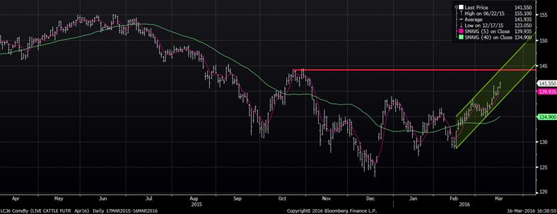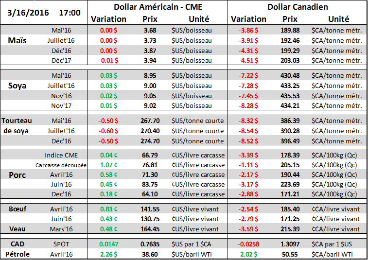 Similairement au dollar canadien, le prix du bœuf a aussi atteint un nouveau sommet depuis le début novembre, terminant la journée à 141.55 sur avril pour un gain de 13 cents ce dernier mois (graphique 4). Contrairement au porc dont la production est légèrement sous les niveaux de l’an dernier, la production de bœuf est 0.8% de plus qu’en 2015 pour la période du 1er janvier à aujourd’hui. C’est plutôt la demande locale qui permet au prix de rebondir avec le prix des carcasses de bœuf découpées select et choice en hausse depuis la mi-février, à 2.24 $US/lb et 2.34 $US/lb respectivement. Il reste à voir si la tendance continuera lorsque la production augmentera de 3% à 4% comme l’USDA le prévoit pour les 6 prochaines mois (si ça l’arrive…).